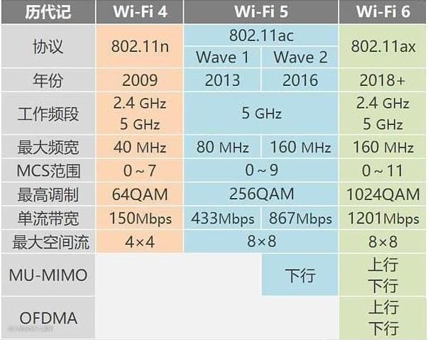 首先来看下wifi协议编年史,所谓wifi6,其实也就是802.11ax技术,目前最新的一代;wifi5 指的是 802.11ac 技术,则是上一代,也是目前应用最广泛的;wifi4 指的是 802.11n 技术,从 2013 年开始,它就开始被 802.11ac 所取代。目前市面上的wifi路由器以wifi5和wifi4为主,wifi6已在今年兴起,是未来的主流。