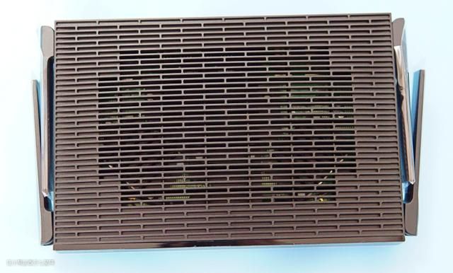 ▲MR9600顶部和底部都是大面积的散热格栅,看上去散热能力应该不错,不过会不会容易积灰呢?底部另外还有橡胶防滑垫以及一些路由参数信息标签,路由名称、密码、PIN码等信息都在标签上。