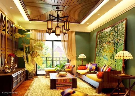 东南亚风格的装饰中,室内所用的材料多直接取自自然。由于炎热,潮湿的气候带来丰富的植物资源,木材、藤、竹成为室内装饰首选,东南亚家具大多就地取材。