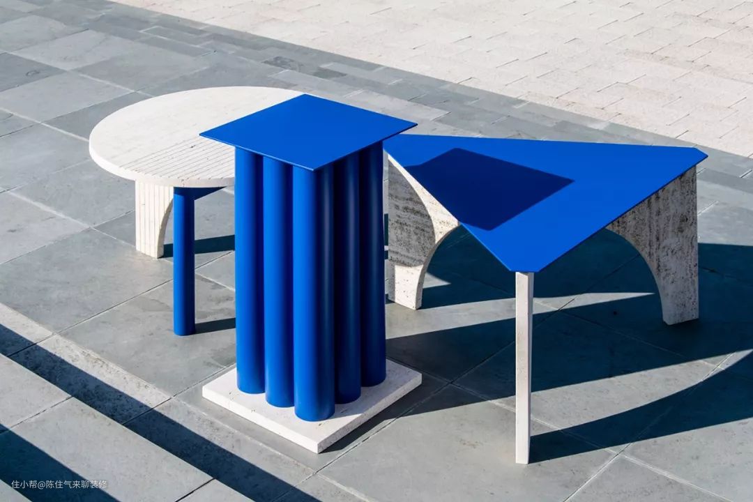 同样都是蓝色系的色彩搭配不会给人带来重复的感觉,反而可以带来不同的色彩感知。不同程度的蓝与”克莱因蓝“的中和下,显得更加耀眼。