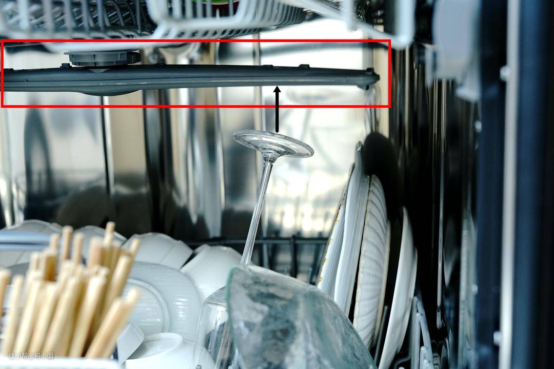 摆放碗筷的时候,注意技巧,按照官方图示来摆放,间隔大的格挡摆放深盘深碗,间隔小的格挡就要摆放小盘浅碟,大的深碗扣在下层左下角预留的大区域内,上层一般摆放轻度污渍小器皿和杯子,下层一般摆放重油污和深碗盘,摆放的时候要注意到洗碗机里有两个喷淋臂,这个是上喷淋臂