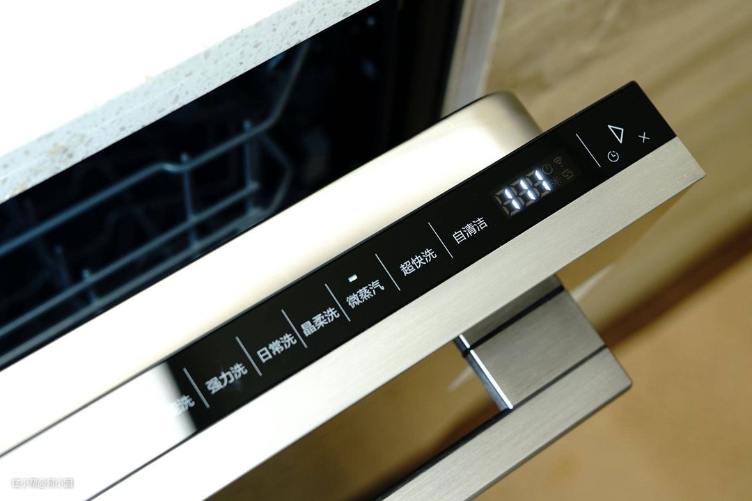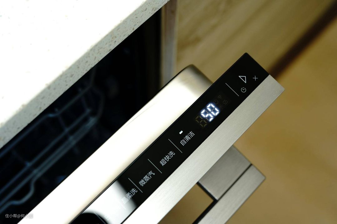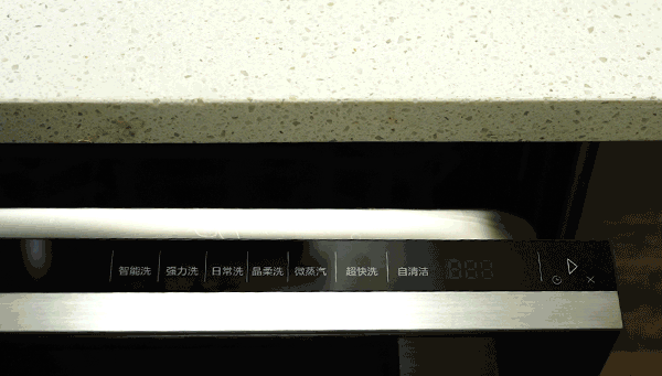 一台洗碗机,家里肯定不是一个人用,一般来说和老人住的会和老人一起用,洗碗机是否便捷好用,简单,功能容易记忆就是很重要的了,这台洗碗机的控制区域在机器最顶部,这样的设计能保证洗碗机的整个面板上没有按钮,整体性更好,也更好看
