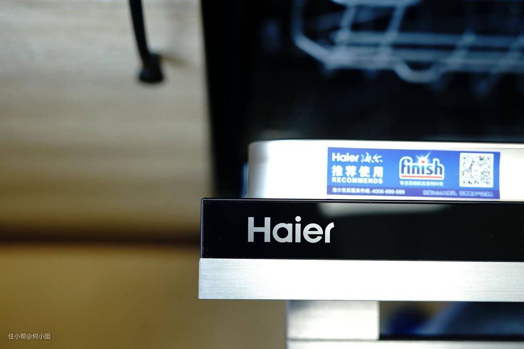 拉开把手,左边是海尔logo和finish洗涤剂的推荐