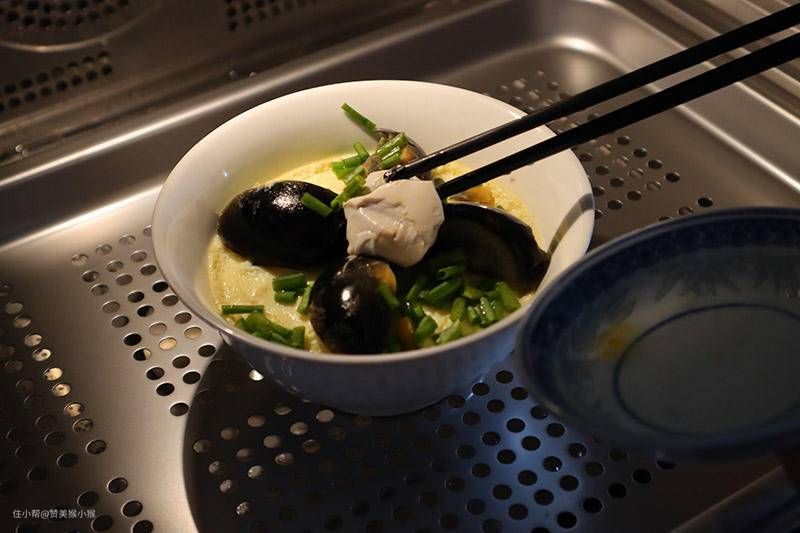 ▲蒸完10分钟后,打开蒸烤炉门,然后再将原先准备好的皮蛋、咸蛋黄和葱段加入,再关上蒸烤门同样温度再蒸5分钟。