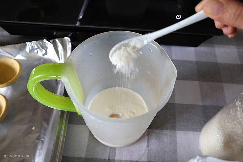 ▲重点就是制作蛋液,倒入牛奶,打入鲜鸡蛋,放入白糖、炼奶,然后用勺子充分搅拌,需要注意一下蛋液的量,80毫升普通纯牛奶,就可以制作6个蛋挞液,大家可以大概参考一下。
