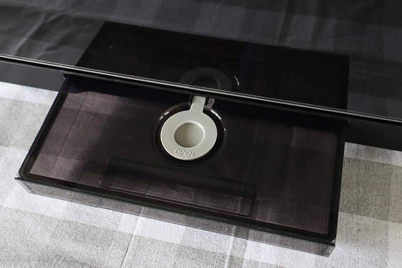上开黑色金属把手,黑色钢化琉璃面板显得很低调,下方为水盘以及接水架,整体色彩保持一致,外观非常百搭,能很好适配家居。
