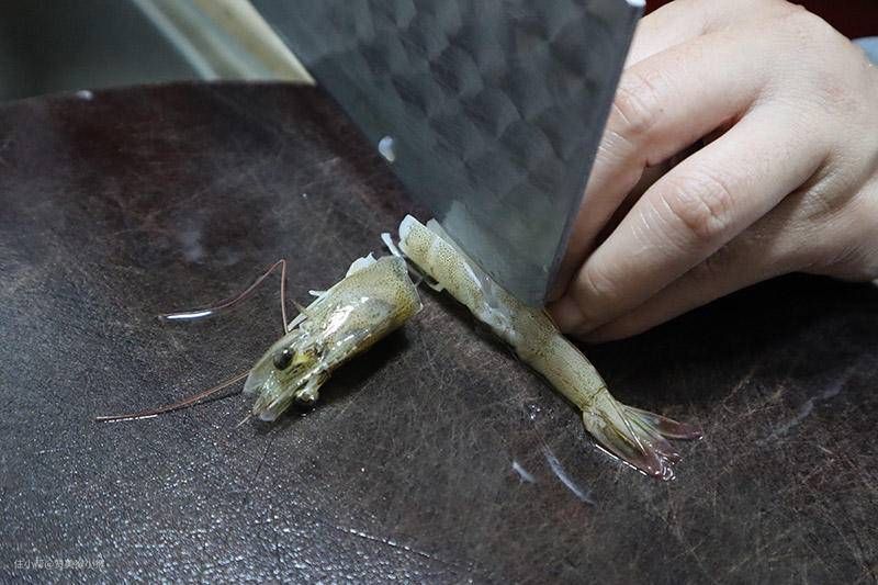 ▲鲜虾去头,从背部切开并清掉虾线,然后备用。