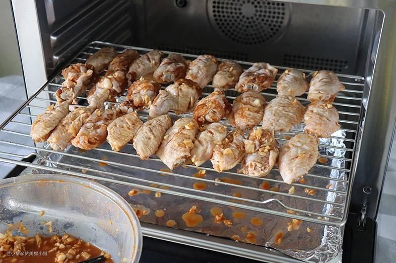 ▲接油盘上铺上一张锡纸用于接滴下的料汁,方便清洁,然后将腌制好的鸡翅鸡腿分别放上烤架,同步推入烤箱。