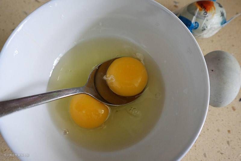 ▲首先准备好鲜鸡蛋两枚、皮蛋咸鸭蛋各一枚,各人可根据喜好自行调整蛋量,将鲜鸡蛋打碗里备用。