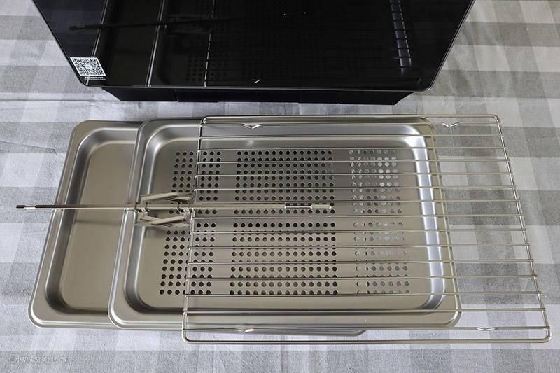 其配件包括包括接油盘、蒸盘、网架、转架以及转叉,基本能够满足日常家蒸烤菜肴使用了,如果想做烘焙,还需要另外购买烘焙的工具。