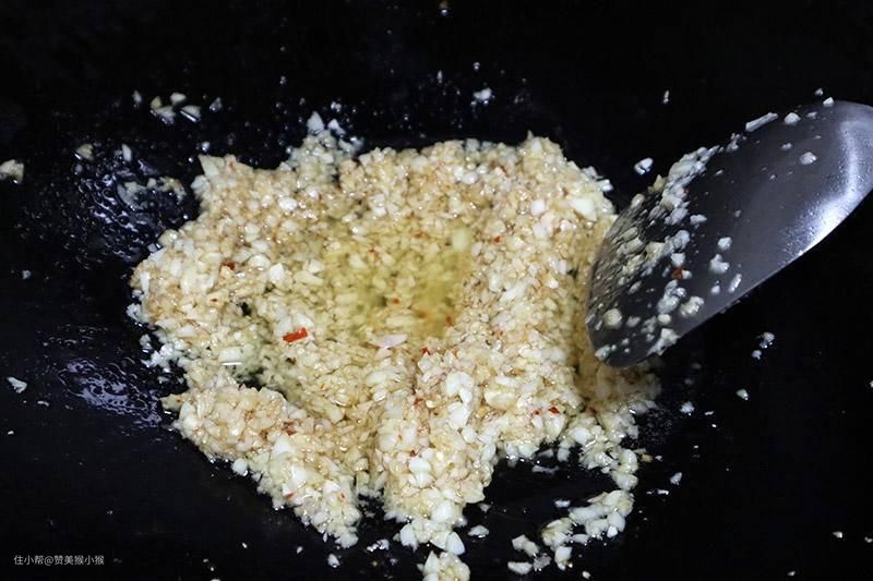 ▲将蒜和辣椒切碎后,放入锅中加油和盐爆炒一会,起锅时加少量的生抽和蚝油提色和加味。