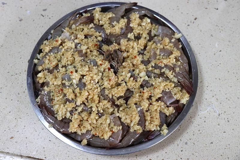 ▲先在碟底部铺上粉丝,然后再铺上去头的虾只,最后再在上面淋上煎过的蒜蓉。
