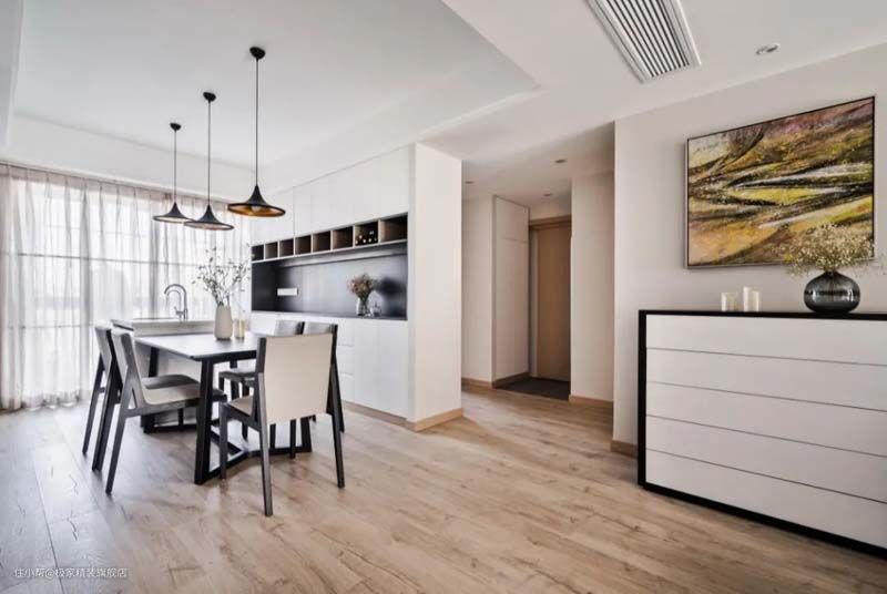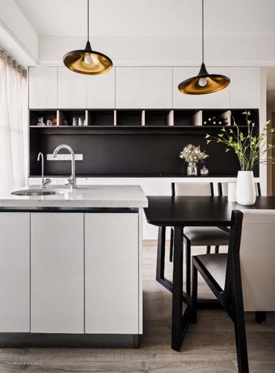 黑与白的鲜明搭配,造型简约的家具,组合形成能舒缓心情的就餐区和简易的西厨区。