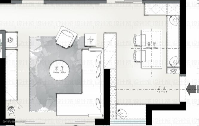 ▲根据这个小户型的实际情况,餐桌挨着鞋柜布置,我们把鞋柜与餐边柜设计成于一体的,并在柜子的侧边加入开放格架,方便存放常换的鞋子。