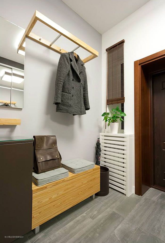 玄关装个衣架,同时挂3件薄外套➕1件大鹅羽绒服无压力。衣服下面放包,左侧放钥匙,右侧放雨伞,这样进门就能解放双手。