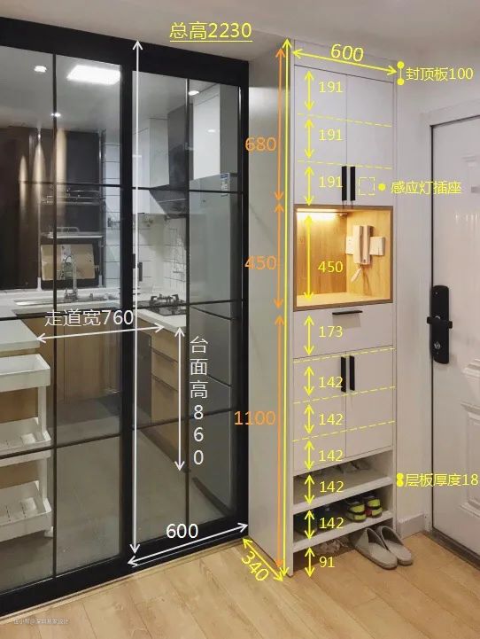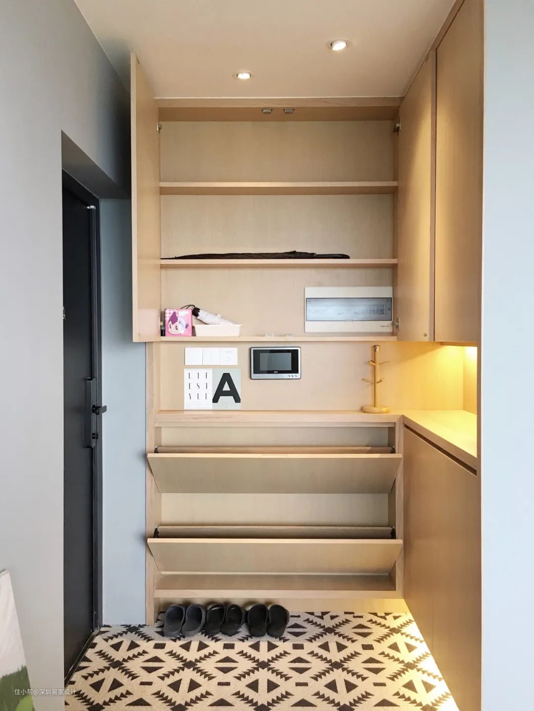 座椅下空出40cm的常用鞋位,敞开式隔板,不设门板,平时进家门后可以站着直接换鞋,玄关凳旁边的柜子就可以收纳首饰、钥匙、钱包等零碎物。