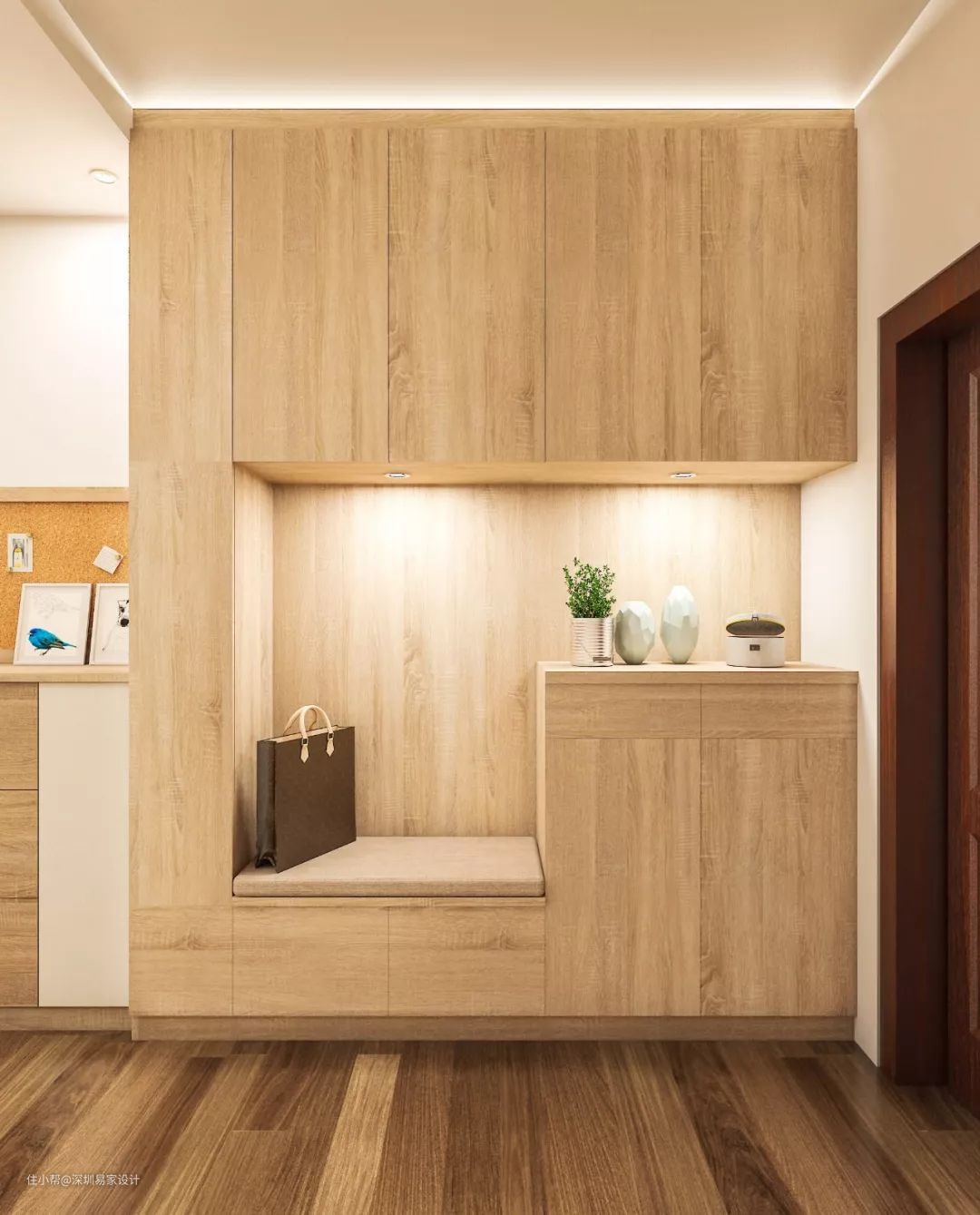 除此之外,玄关凳还可以和收纳彼此融合,和衣柜、衣帽架等一体打造,嵌入墙体,提高空间利用率。