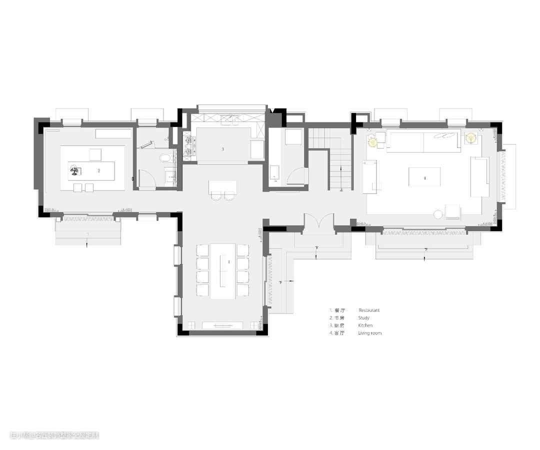 餐厅和厨房整个布局呈一字直线排开,既是彰显行的端站得直,刚正不阿的端庄品性。