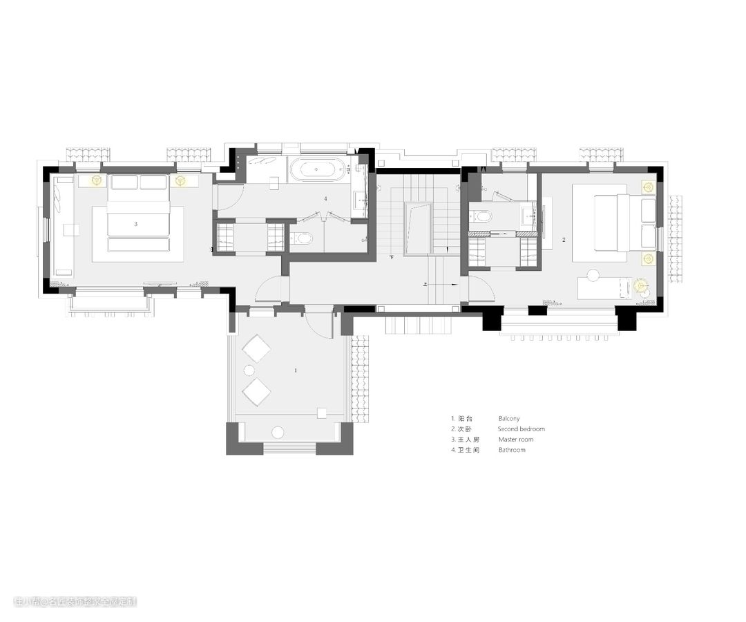 衣帽间、休息区、沐浴区、如厕区,各区域分离设计的同时,各区域也相通,化繁为简,用最少的设计语言,表达最深的设计内涵。