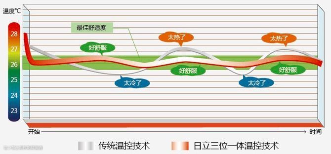 日立的三位一体温控技术能随需动态调节能量输出,精准把控室内温度,让人整体感受更舒适。