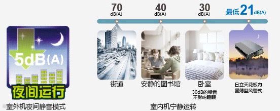 例如日立的室内机,采用新型蜗壳防震动设计,运行噪音降至21dB,室外机采用智能变速风扇设计和高速消音设计,而专设的夜间运行静音模式最大可使夜间运转噪音较白天降低5dB。
