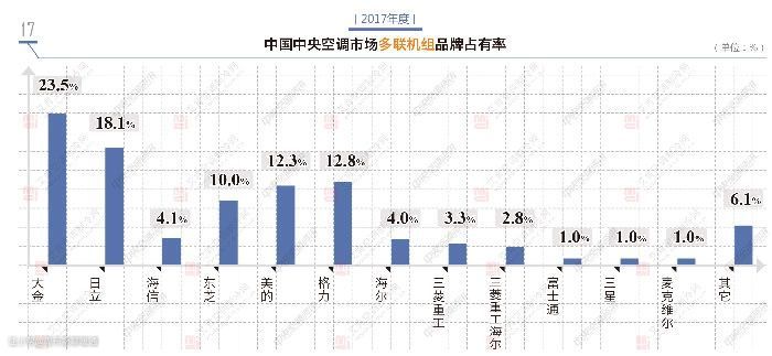根据2017年的行业数据来看,多联机组产品市场总出货额达到430亿元以上,同比上期有所增长,而且是所有产品类别中增幅最大的。与此同时,多联机组在整个中央空调市场中的占比达到47.8%,同比上年提升了7个百分点左右,可以说,企业在多联机市场的品牌地位决定了其在整个中央空调市场的品牌地位。