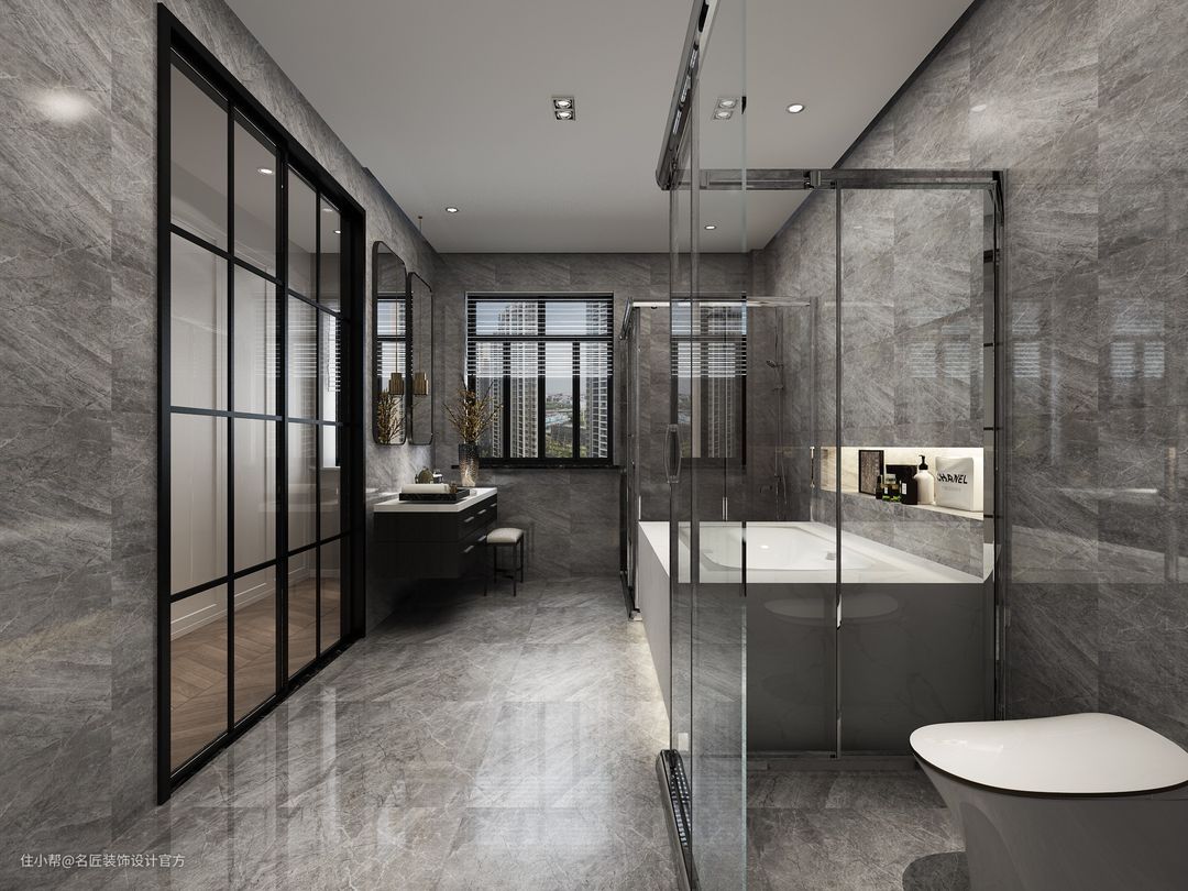 灰色系的瓷砖铺满空间完全不觉得昏暗,浴缸下的灯带,加上壁龛设计,为整个空间带来一丝特殊色彩,完美的细节运用。