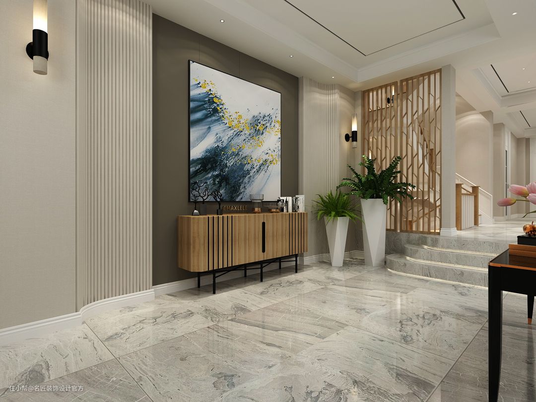 映入眼帘的玄关台采用中式木柜,米色背景条形石膏线,辅以深色的背景色,搭配素色的装饰画,形成鲜明对比。远处搭上木栅格隔断,更有朦胧美。