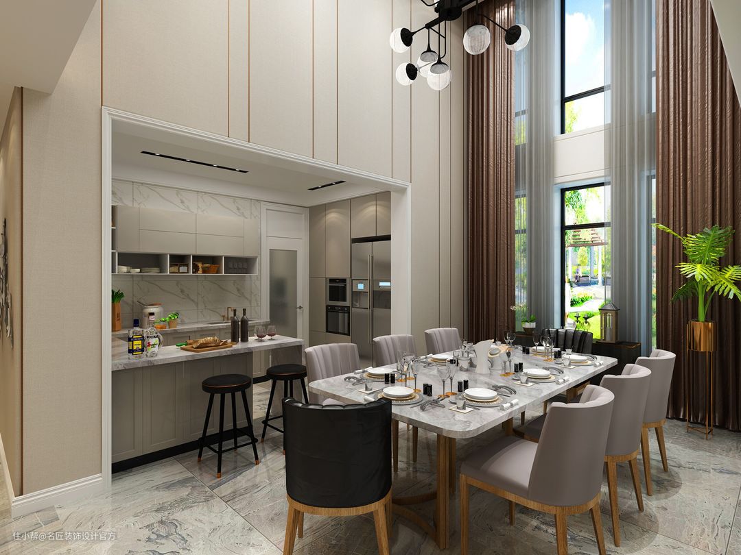 一垂到顶的窗帘软装搭配,线条利落大方营造瀑布的感觉,盛世壮观。木质支架搭上圆滑大理石台面的餐桌,既要美观也要实用。