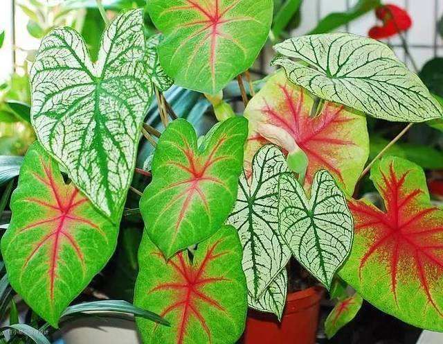五彩芋叶子十分的翠绿,叶子中间会有红色的叶子向间、耀眼的白斑点呈现在翠绿之上似锦如霞,五彩芋加上白叶绿脉、红叶白脉相互搭配,给人更加艳丽夺目、高贵典雅的感觉。而彩叶芋经常给作为室内盆栽植物,通常都是放置在桌上或者是窗台,显得更为雅致和典雅。特别是放在落地窗那里,更有一番风景,或者是庭园栽植,亦可切花作花材和其他花卉搭配成花束。当人们劳累了一天的时候,回家看到自己家里的五彩芋生长的如此的有生命力,能给你带来欢喜、愉快的感觉。所以,它的花语为喜欢、欢喜、愉快。