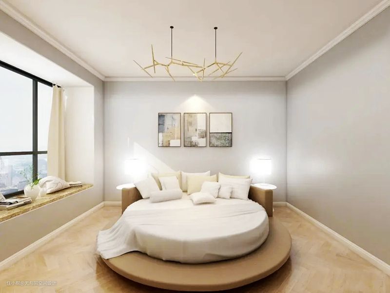 现在大多数的年轻人生活方式追求自由、创新。主卧圆床柔和了直线线条,实现整体空间的融合,营造出慵懒、随意的氛围。