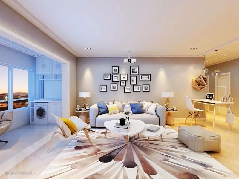 客厅以黑白灰为主色,搭配鲜亮的金黄色软装,无不时时刻刻象征着现代人多姿多彩的生活,客厅投影仪替代电视机,屏幕大,省地,最重要的是护眼。