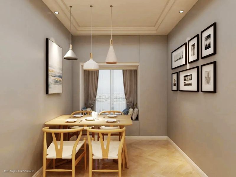餐厅与客厅以不同颜色的墙面做一个分区,黑白色系始终被奉为经典色,随之延伸出的多种色彩,在空间中搭配原木色的桌椅,返璞归真,更让人心旷神怡。