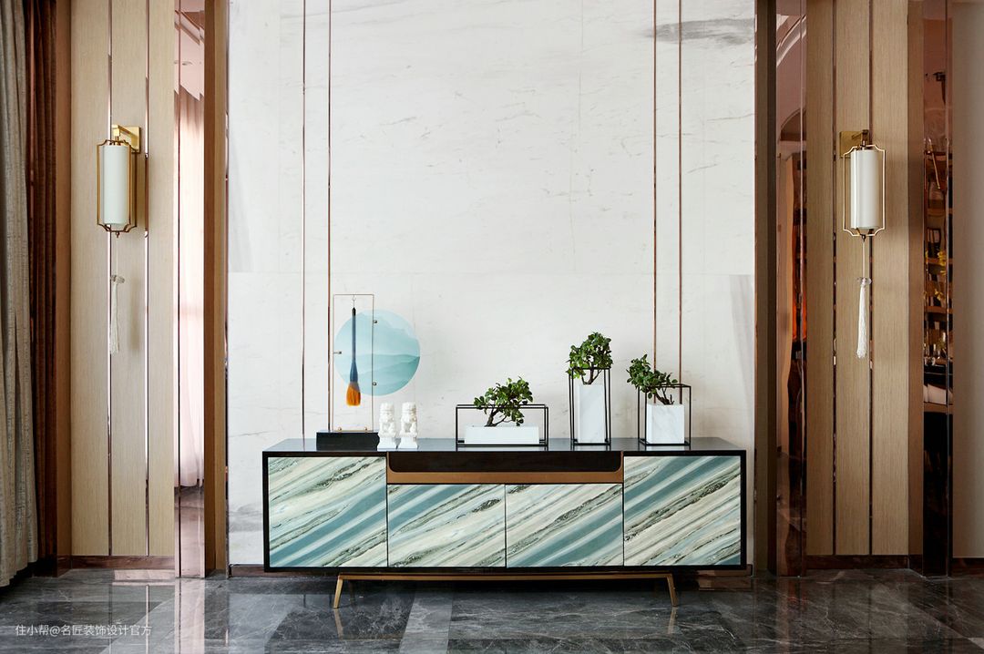 玄关以明亮的米色调为主,金属支架搭上原木的柜体,配上艺术画和绿植,符合新中式定位。