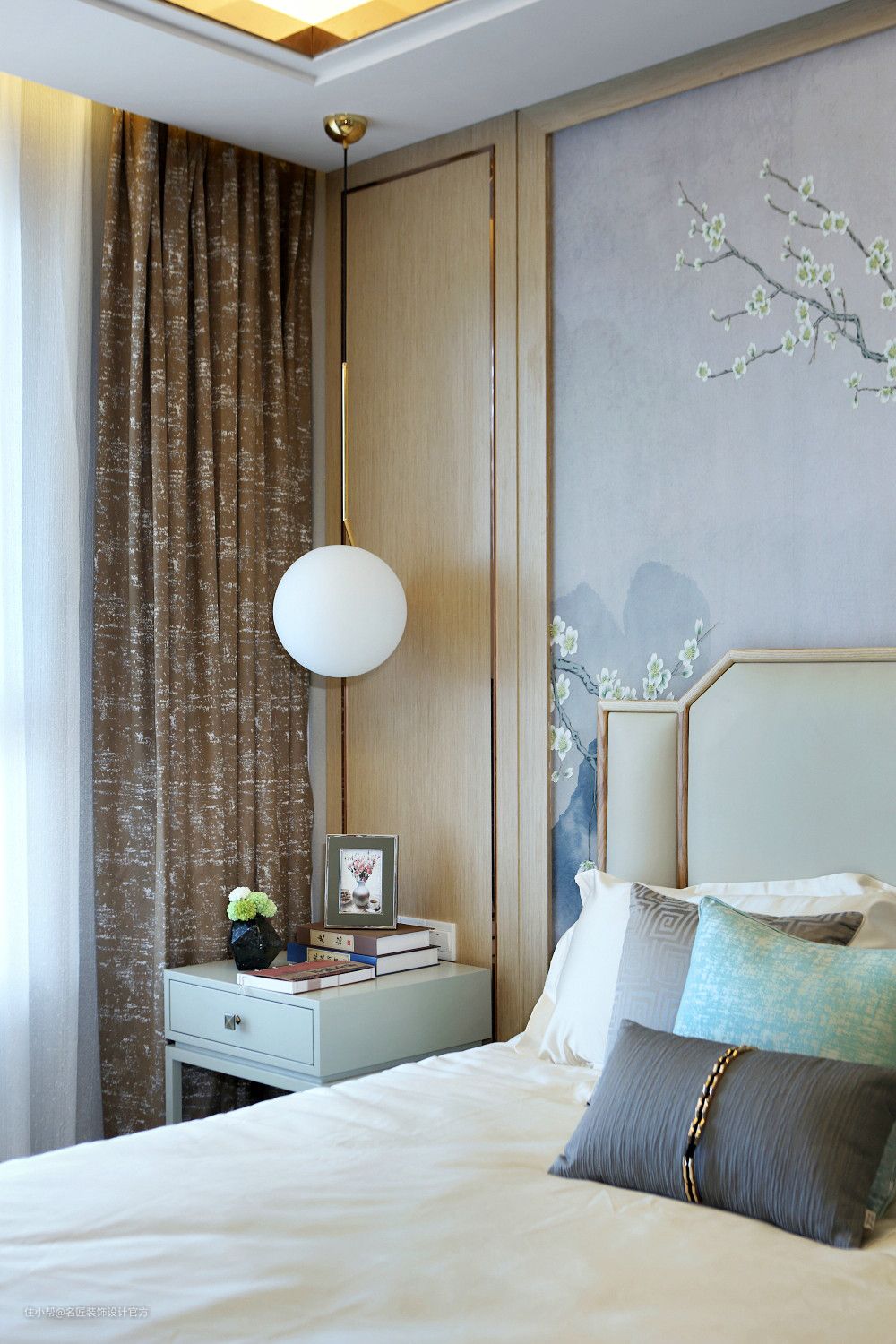 墙面用花开图墙布,背景墙用木制硬包,线条勾勒明显。