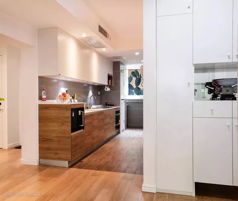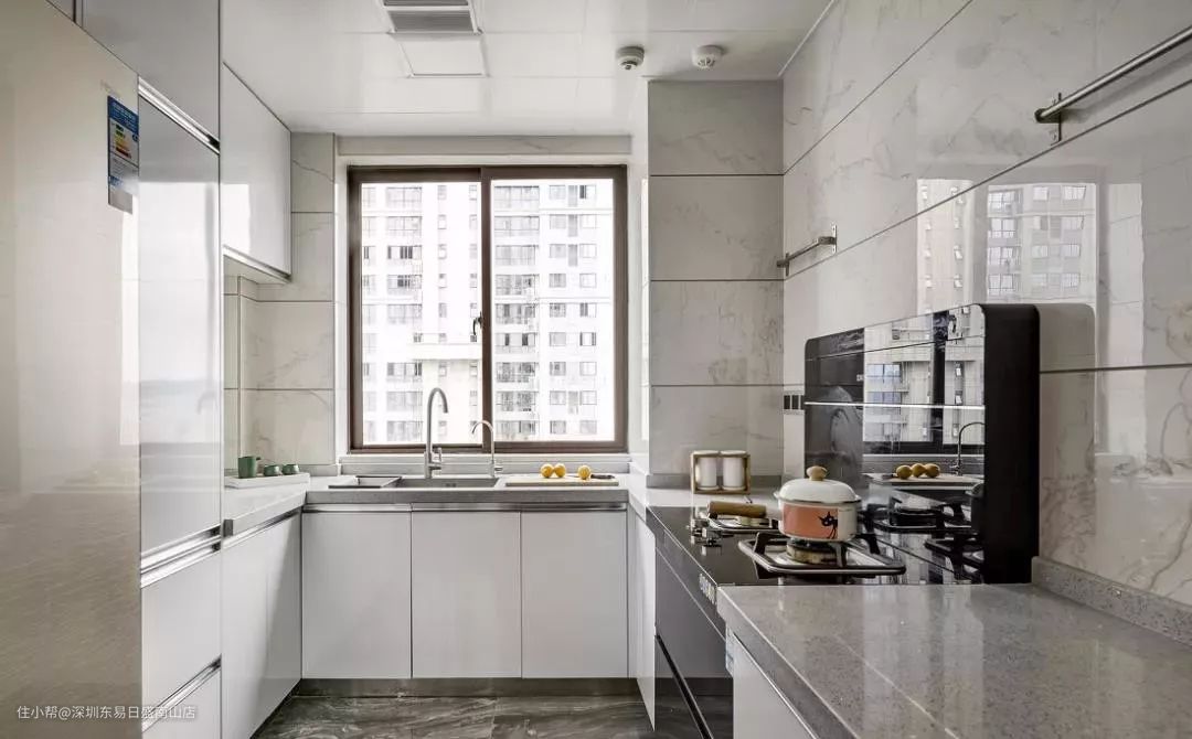 厨房里的每一寸都是值得利用的,多个转角能多出挺多的储物空间或操作台面。在一字型的基础上多了一个转角,就形成了L型的布局。把水槽和灶台放在两端,中间留空的地方作为操作台,平时洗菜-切菜-炒菜的动线布局也非常的合理。