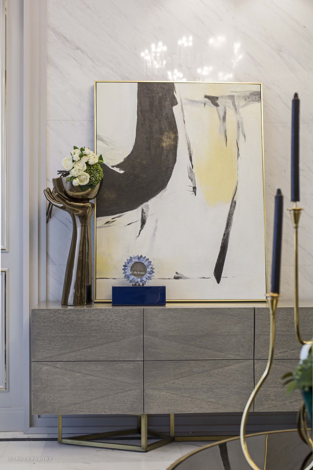 前移向左看去便是客厅,以灰白浅色调为主,繁复而精细、考究的细节设计。