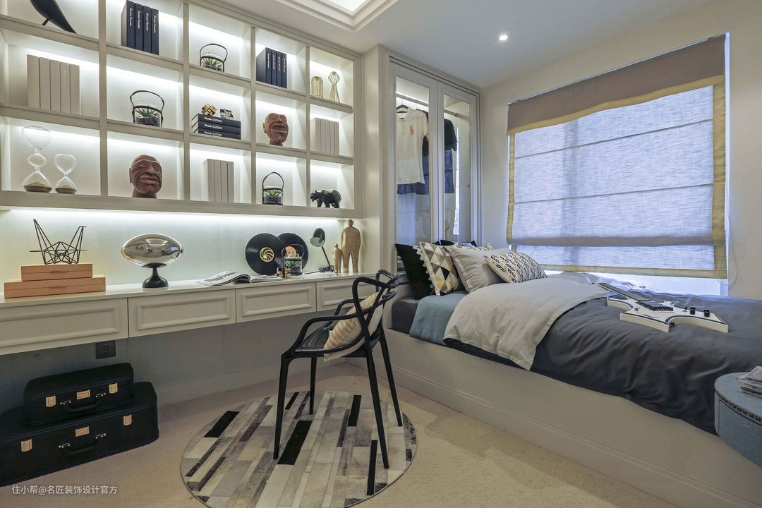 一排的抽屉上墙设计,提供宽敞的学习空间,上面书架展示柜又起到装饰作用。