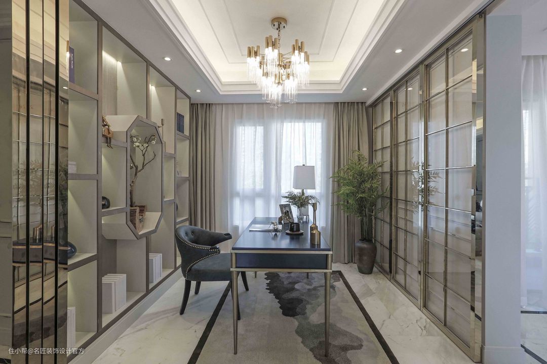尾部设立玻璃质透明隔断书房,加以金属色不锈钢描绘边框,让空间感觉更加宽阔的同时,功能分区明显,又不失奢华。