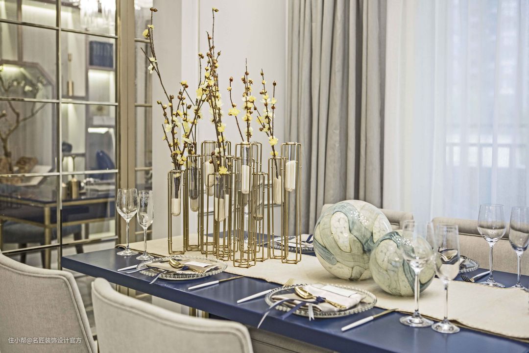 餐桌的蓝色着重配色,打破空间的宁静,将布艺的柔软和石材金属的硬朗为对比。
