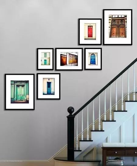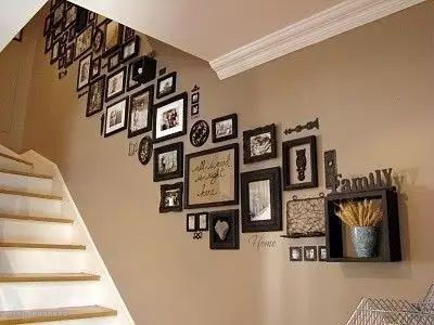 楼梯上的照片排列最好是成一个斜行,和扶手平行。