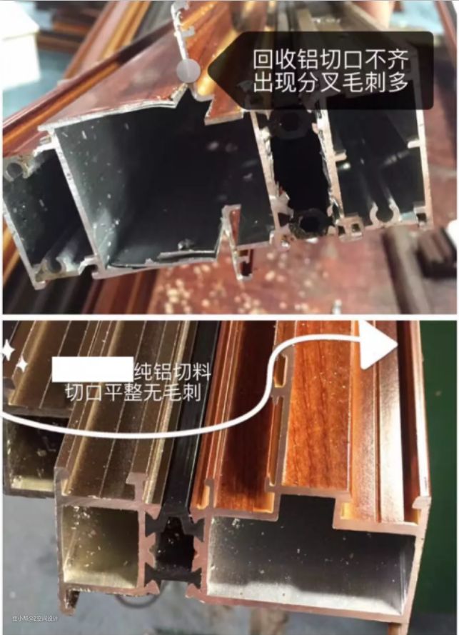 另外,还可以看切面料头,能大致感觉铝的品质。有的回收铝挤压的铝型材,切面较暗,不平整。