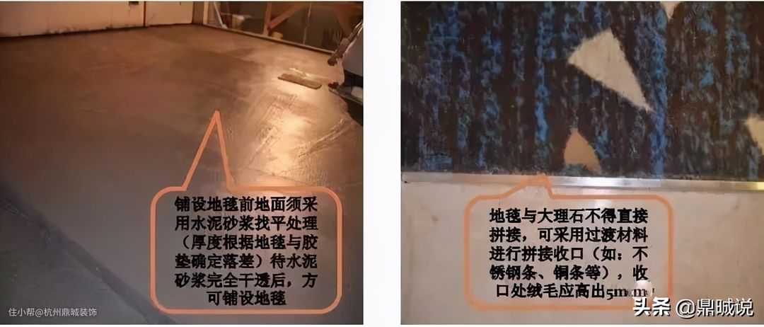 2、铺设地毯前地面须采用水泥砂浆找平处理(厚度根据地毯与胶垫确定落差)待水泥砂浆完全干透后,方可铺设地毯。