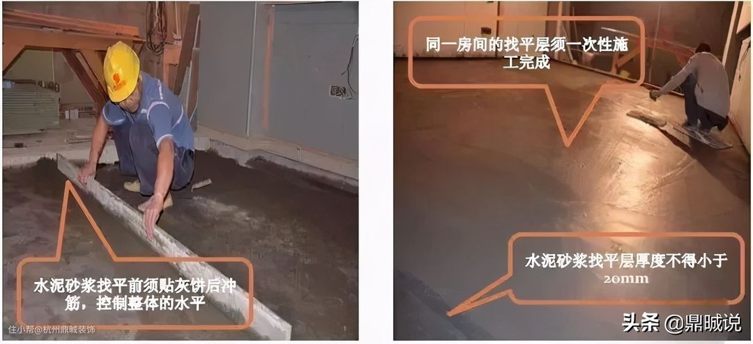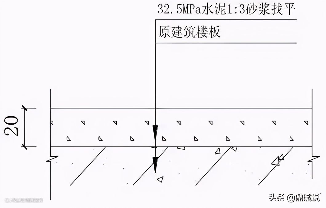 2、根据±0.000m标高扣减饰面构造厚度来确定地面找平标高(设计有要求的按设计要求确定),并在四周墙脚弹线;水泥砂浆找平层的厚度不应小于20mm。