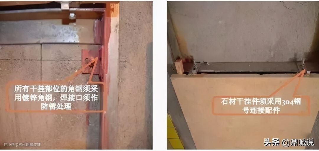 2、应按石材排版图进行现场钢架布置;挂件与钢架连接应正确(反向、焊接)