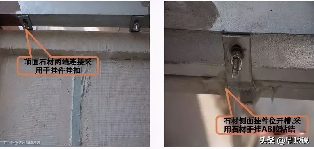 6、顶面石材两端连接采用干挂件挂扣(石材侧面挂件位开槽),采用石材干挂AB胶粘结;石材边长大于600mm时中段点再用石材干挂AB胶将挂件与扁铁粘结;末端石材须搁置在墙面上,采用石材干挂AB胶粘结牢固;表面平整度1mm/2m靠尺和塞尺。