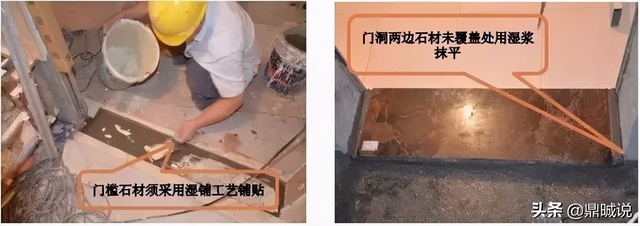 3、 门槛石材须采用湿铺工艺进行铺贴,预防淋浴用水落地后向外渗透。