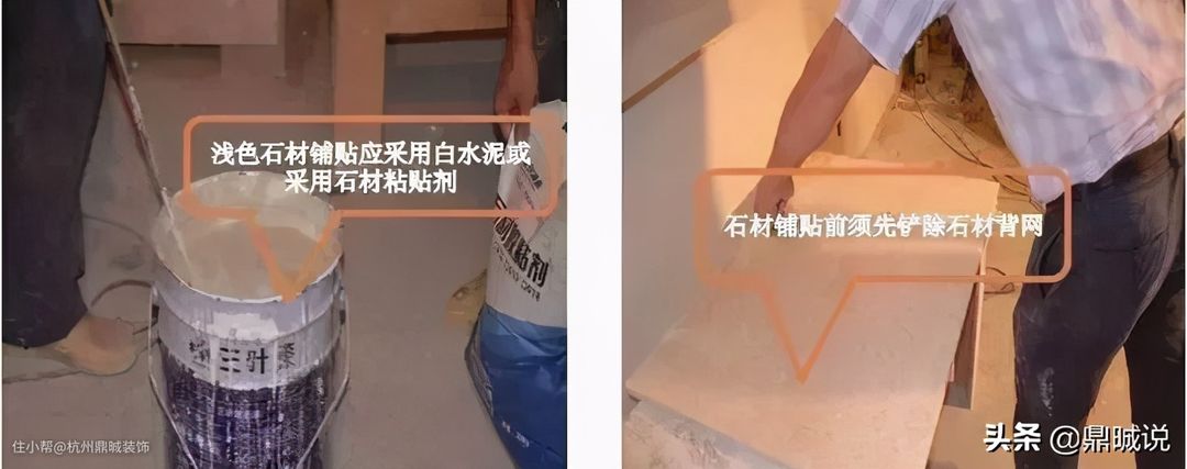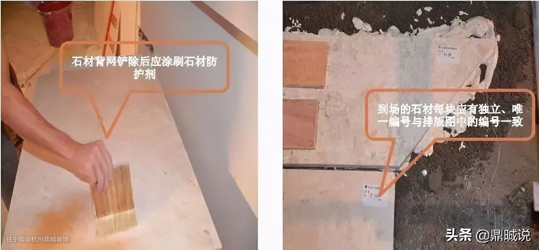 6、大理石在铺贴前应铲除背后网格布,并补刷石材防护剂,晾干后进行铺贴;若质地较为松脆的石材,则须在工厂对石材背面去网后做背胶或背砂处理,到场后直接铺贴。