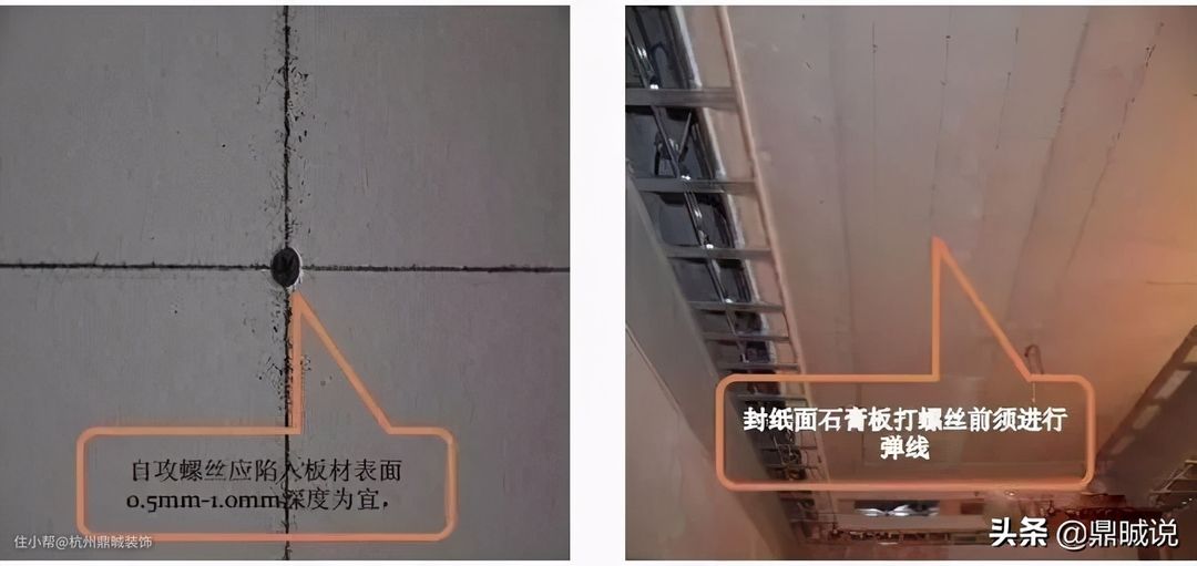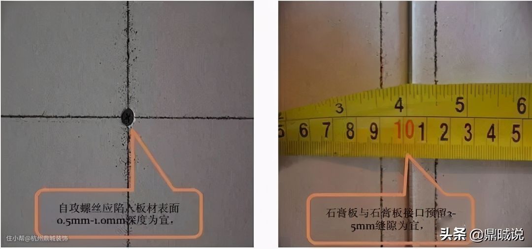 4、自攻螺丝安装应陷入板材表面0.5mm-1.0mm深度为宜,且不可切断纸面暴露石膏。