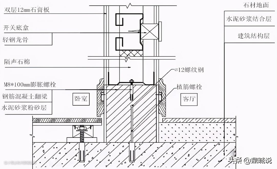 施工工序:隔墙放线定位→安装天地龙骨→安装竖向龙骨→安装横向龙骨→龙骨内敷设隐藏管线→门洞口、窗台口加固→封一面石膏板→填充隔音棉→进行隐蔽验收→再封加一面石膏板